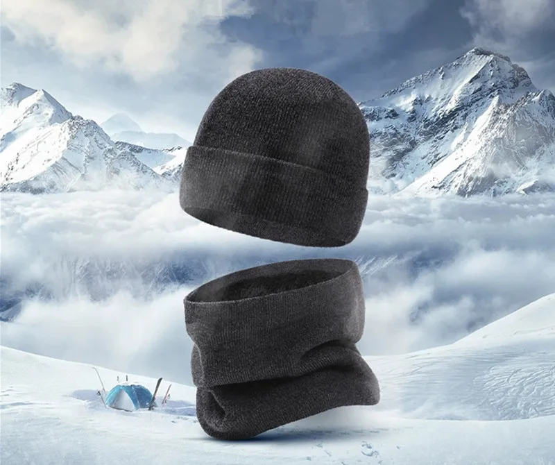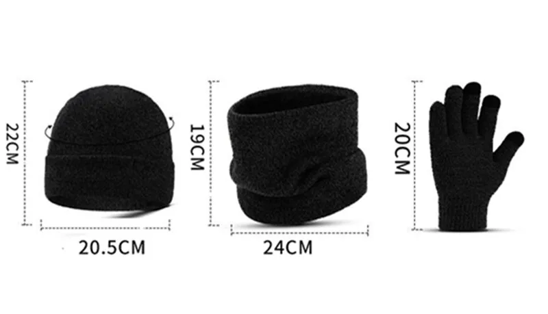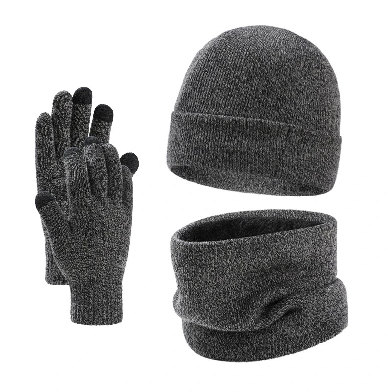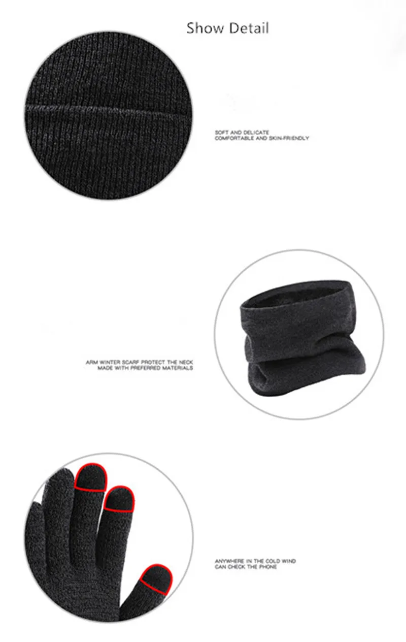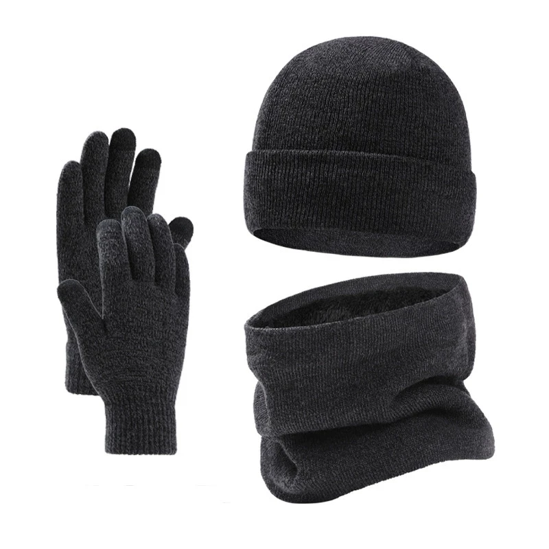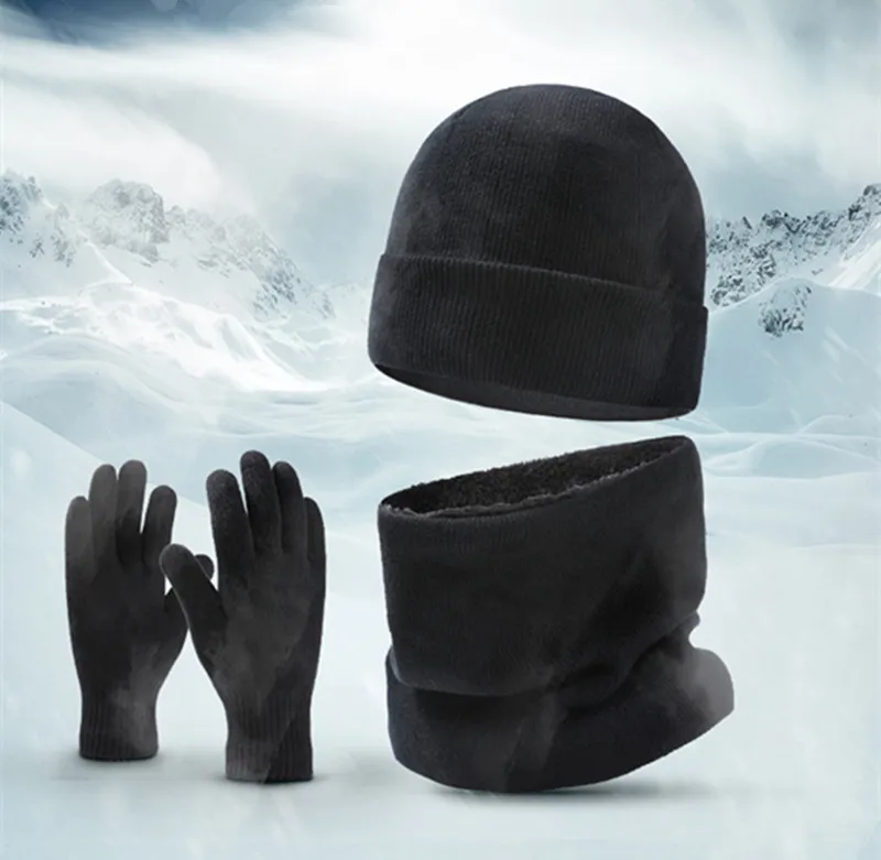 Autumn Winter Outdoor Warm Brushed Men's Beanie Hat Scarf Gloves 3 Pieces Set Windproof Knit Ring Muffler Hats and Caps for Men